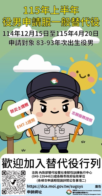 (三)替代役第274梯次(115年5月14日入營):自114年12月15日9時起至115年4月20日17時(或申請人數額滿時)止。